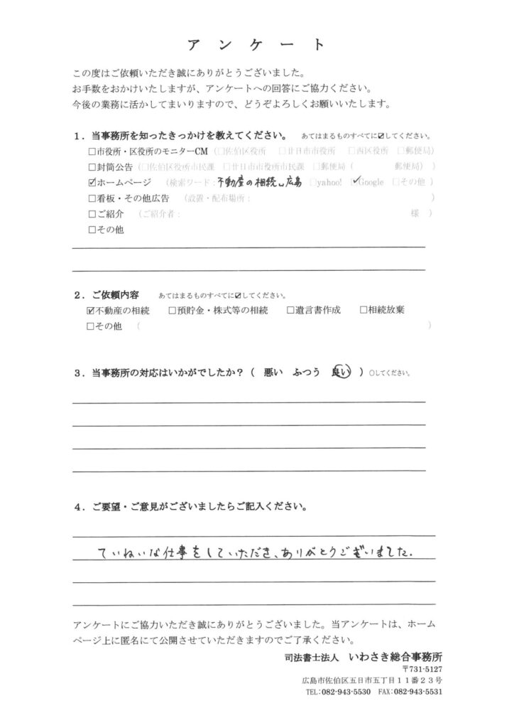 お客様の声-566|広島 相続遺言の相談窓口(司法書士法人いわさき総合事務所)