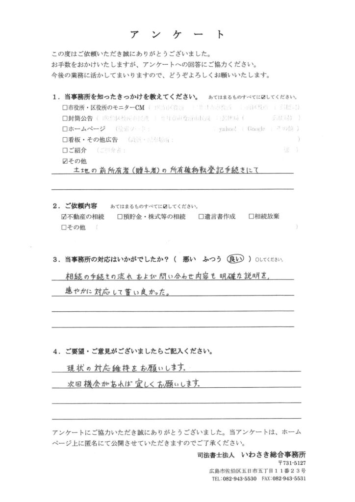 相続の手続きの流れおよび問い合わせ内容も明確な説明を、速やかに対応して貰い良かった。