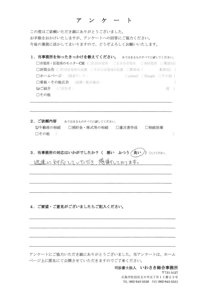 迅速に対応していただき、感謝しております。
