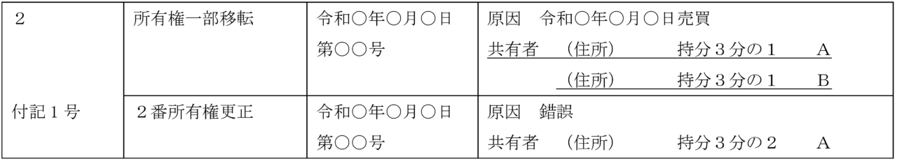 ③ 所有権一部移転登記を所有権全部移転登記に更正するケース(Aに持分2分の1を移転→Aに所有権全部を移転)