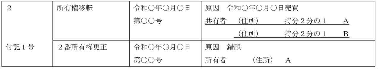 ④ Aに全部移転→Aに2分の1、Bに2分の1移転に更正するケース(A単独所有ということで登記したが、実はAとBが共同で購入していた)