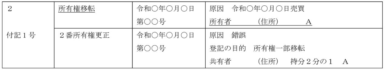 ② 所有権移転登記を所有権一部移転登記に更正するケース(Aに全部移転→Aに持分2分の1のみ移転)