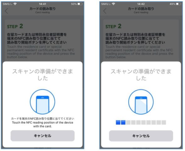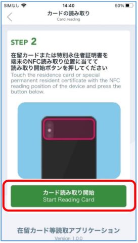 ④ 「次に進む」をタップすると、次の画面が表示されるので、スマートフォン背面にあるNFC読み取り位置に、在留カードを当てて、「カード読み取り開始/Start Reading Card」をタップします。