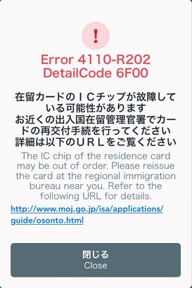この場合は、ICチップが故障しているので、お近くの出入国在留管理局で在留カード・特別永住者証明書の再発行手続きを行う必要があります。