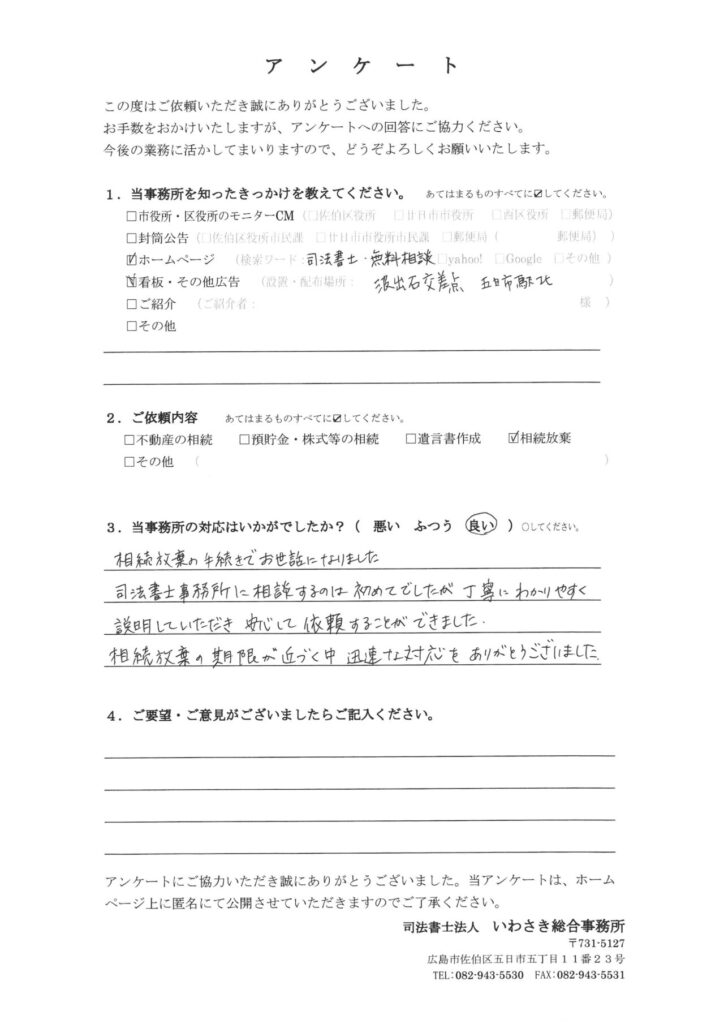 相続放棄の期限が近づく中、迅速な対応をありがとうございました。